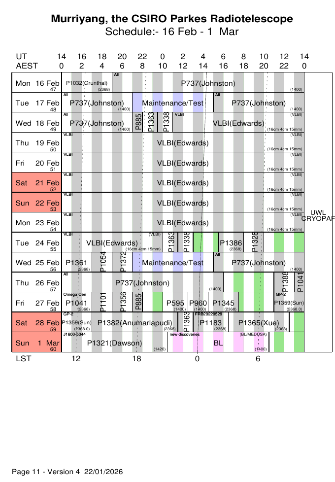 2025OCT Parkes29 Sep - 12 Oct 13 Oct - 26 Oct 27 Oct - 09 Nov 10 Nov - 23 Nov 24 Nov - 07 Dec 08 Dec - 21 Dec 22 Dec - 04 Jan 05 Jan - 18 Jan 19 Jan - 01 Feb 02 Feb - 15 Feb 16 Feb - 01 Mar 02 Mar - 15 Mar 16 Mar - 29 Mar 30 Mar - 12 Apr Schedule Summary Back to Schedule Index Last Modified: Jamie Stevens (22-Jan-2026)