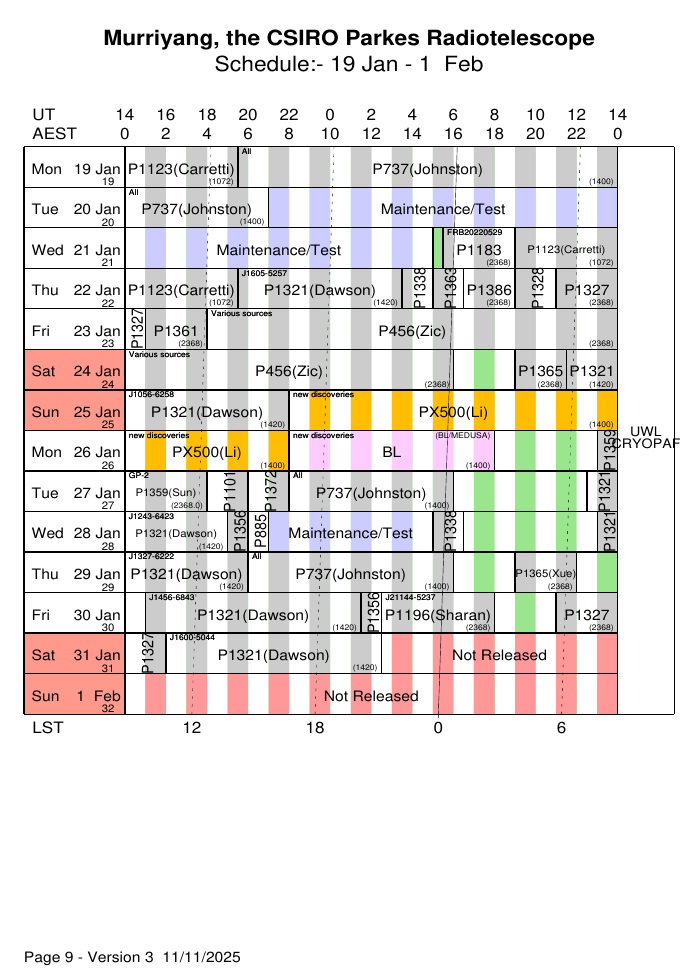 2025OCT Parkes29 Sep - 12 Oct 13 Oct - 26 Oct 27 Oct - 09 Nov 10 Nov - 23 Nov 24 Nov - 07 Dec 08 Dec - 21 Dec 22 Dec - 04 Jan 05 Jan - 18 Jan 19 Jan - 01 Feb Schedule Summary Back to Schedule Index Last Modified: Jamie Stevens (12-Nov-2025)