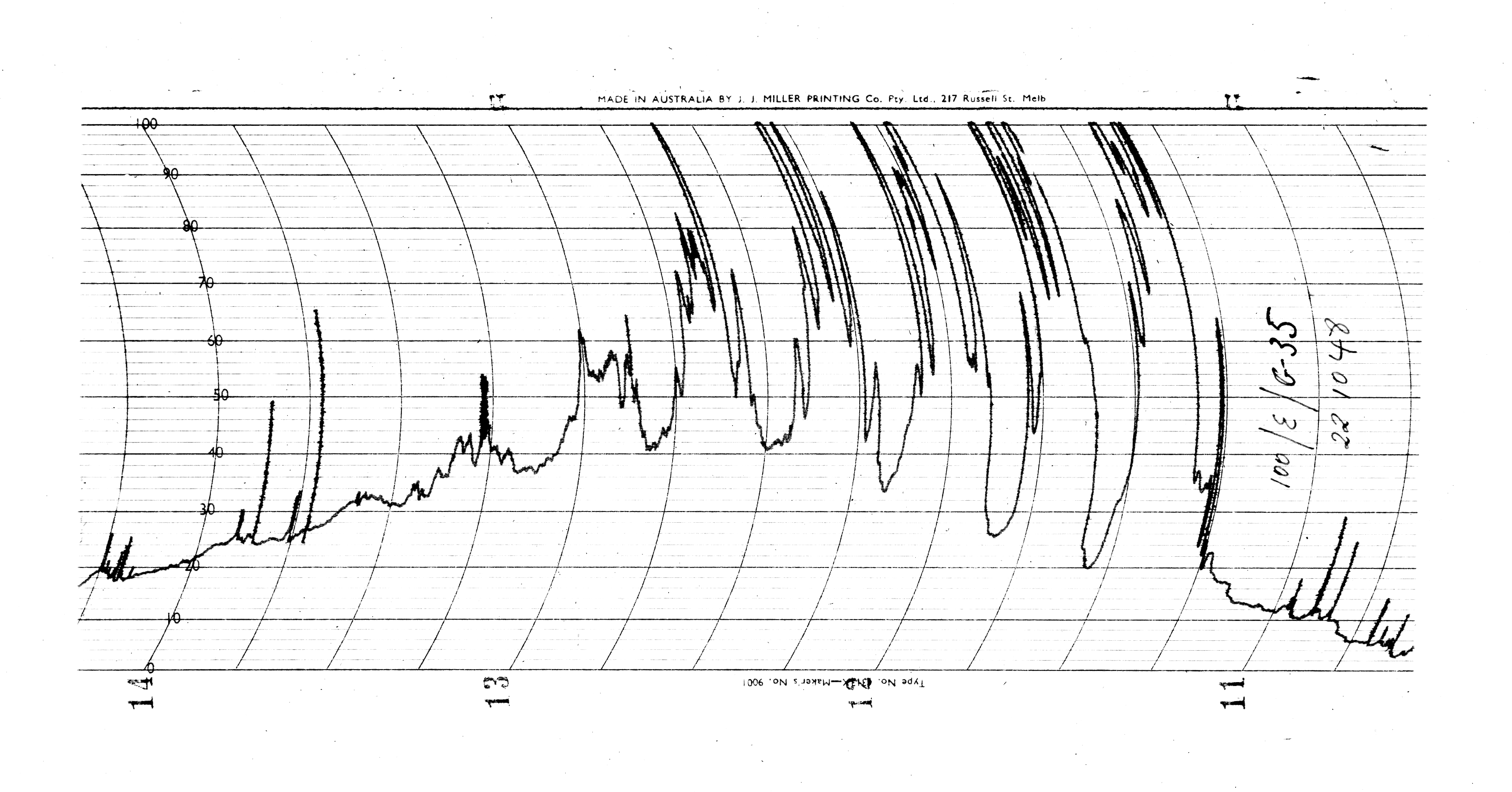 Sea interferometer record of the strong radio source, Cygnus A, obtained at Dover Heights on 22 October 1948 using a 4-Yagi array operating at 200 MHz. Superimposed on the interference fringes are the intensity fluctuations for which this source was well-known.