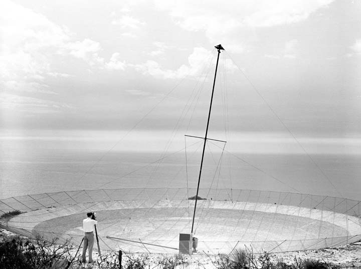 The 12-Yagi array on the ex-WWII radar mount at Dover Heights, adjacent to the blockhouse. This antenna started off as an 8-Yagi array in 1951, and in early 1952 was upgraded to a 12-Yagi array, using cannibalised elements of the earlier 9-Yagi array that had earlier stood on the roof of the blockhouse. This view shows one of the radio astronomers adjusting the antenna, and in the background is the 3.9 metre parabolic antenna on the roof of the blockhouse.