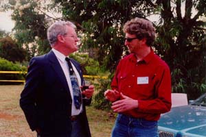 Beneath the great dish of the telescope, the guests enjoyed the pre-dinner drinks. Following the dinner, Dr John Reynolds presented each of the guest speakers with commemorative gifts. He also took the opportunity, on behalf of the Parkes Staff, to formerly wish Dr John Whiteoak and Mr Mal Sinclair happy retirements. Guests were then invited to share with everyone present, their recollections of the telescope and of the official opening in 1961.